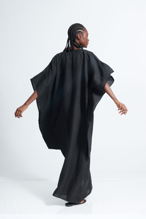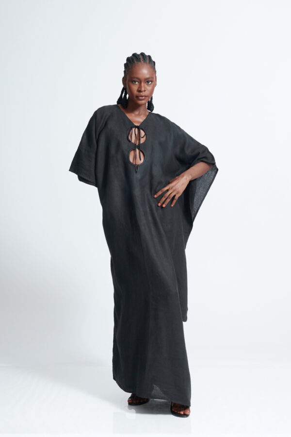An easy breezy kaftan with connecting cut-outs from waist up to a V-neck, and a self tie at the front. Light enough to also wear as an elegant beach cover-up.