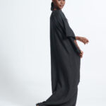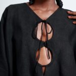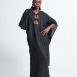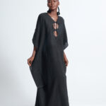 An easy breezy kaftan with connecting cut-outs from waist up to a V-neck, and a self tie at the front. Light enough to also wear as an elegant beach cover-up.