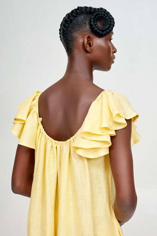 Maxi length dress with dramatic ruffled sleeves, and gathered and elasticated scoop neckline. Has hidden side seam pockets.