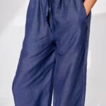 Loose straight pants with hidden pockets and elastic waist, adjustable with drawstrings.