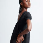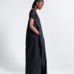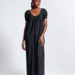 Maxi dress with scoop neckline and short puff sleeves fastened by self covered buttons.