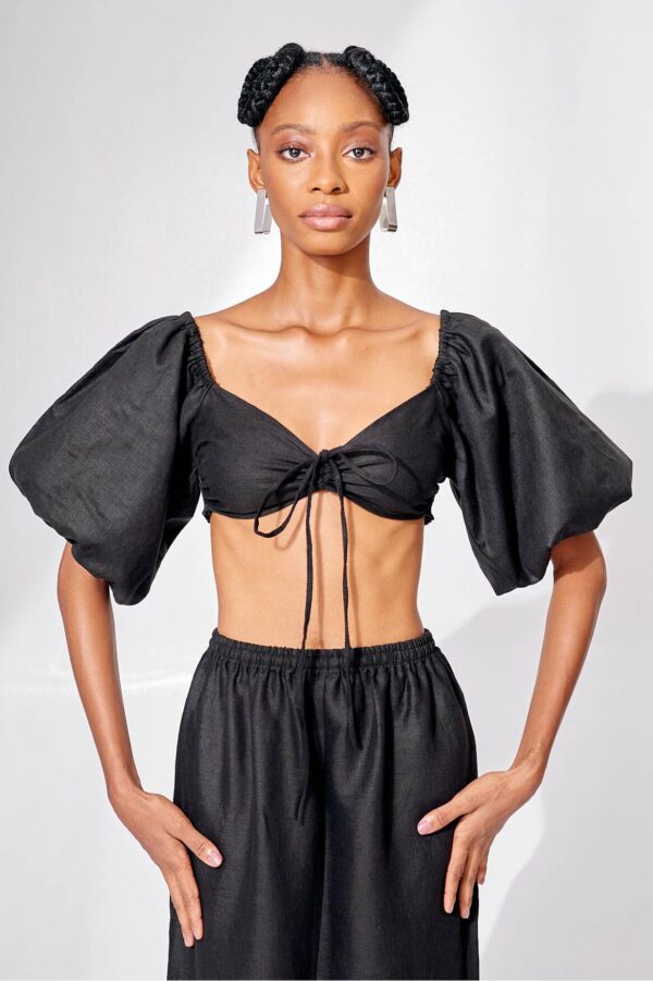 Crop top with puff sleeves, smocked back and adjustable ruched bust detail.