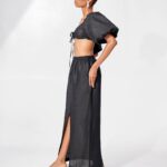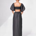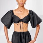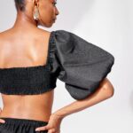 Crop top with puff sleeves, smocked back and adjustable ruched bust detail.
