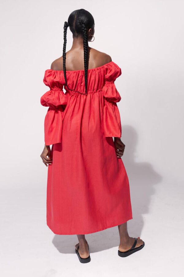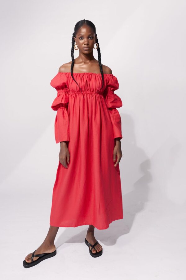 Midi length off shoulder kaftan with elastic gathers under bust and double puffs sleeves.