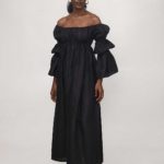 Midi length off shoulder kaftan with elastic gathers under bust and double puffs sleeves.