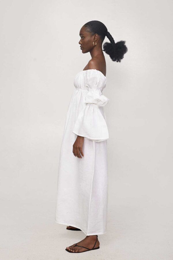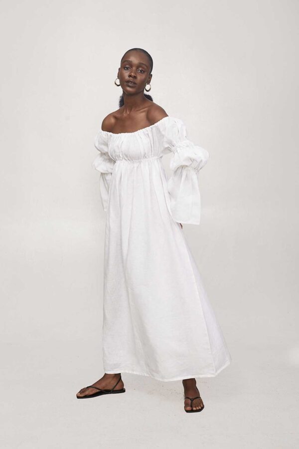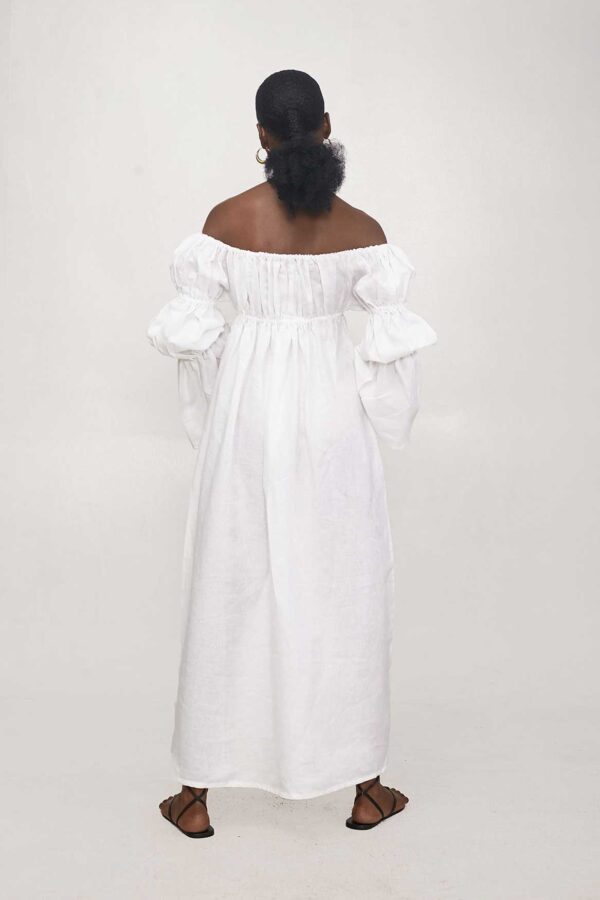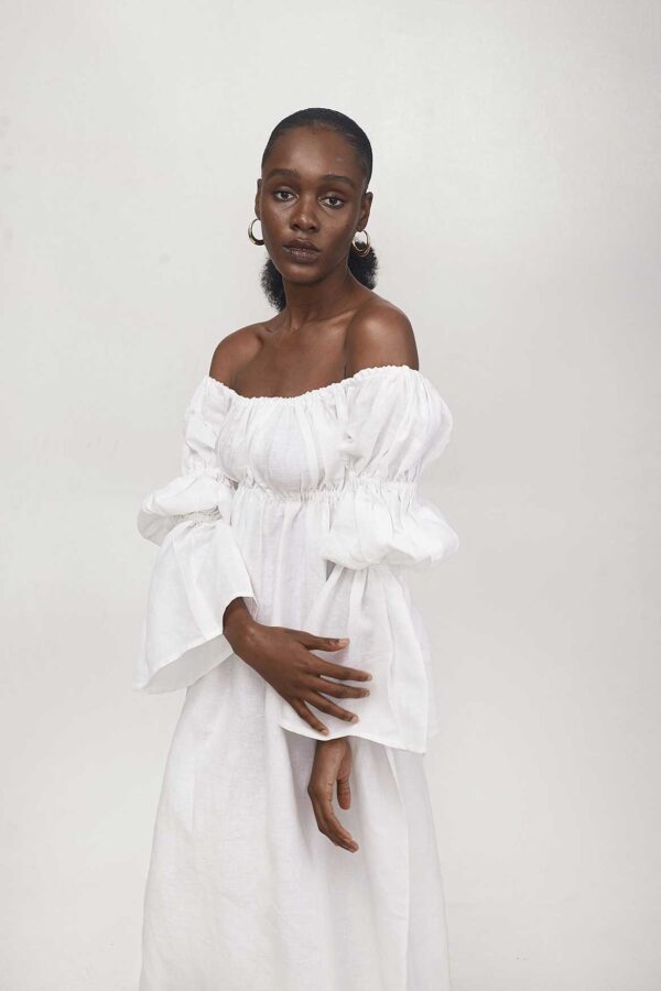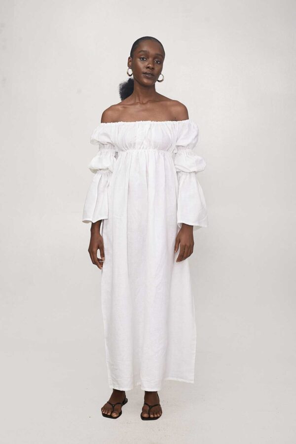 Midi length off shoulder kaftan with elastic gathers under bust and double puffs sleeves.