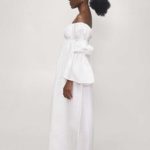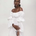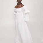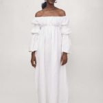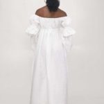 Midi length off shoulder kaftan with elastic gathers under bust and double puffs sleeves.