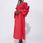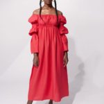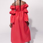 Midi length off shoulder kaftan with elastic gathers under bust and double puffs sleeves.