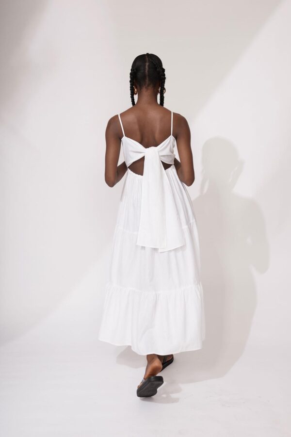 Empire waist midi length dress with three step skirt, skinny straps, and a tie at the back.