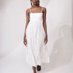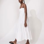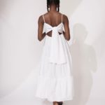Empire waist midi length dress with three step skirt, skinny straps, and a tie at the back.