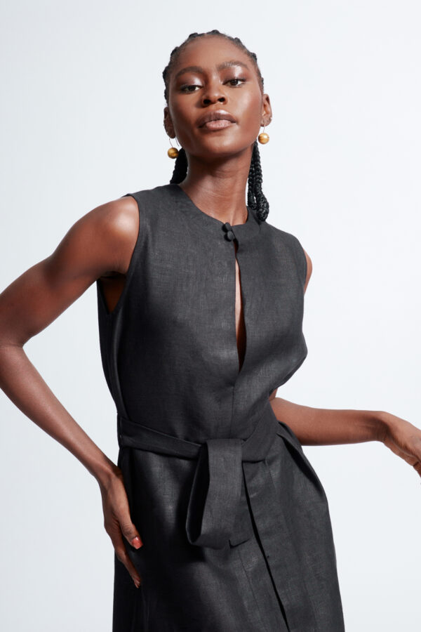 A-line dress with a front slit fastened at the neck with self covered buttons. Removable belt for styling options.