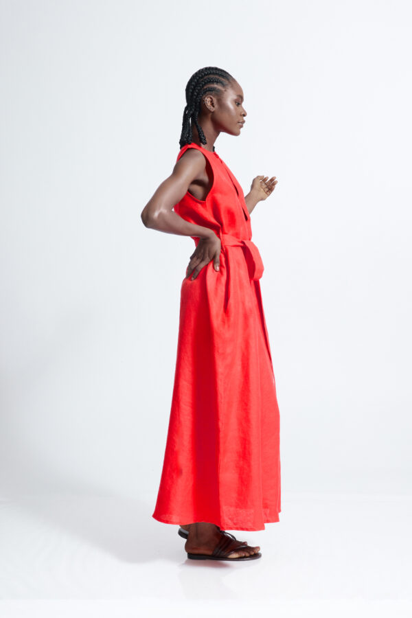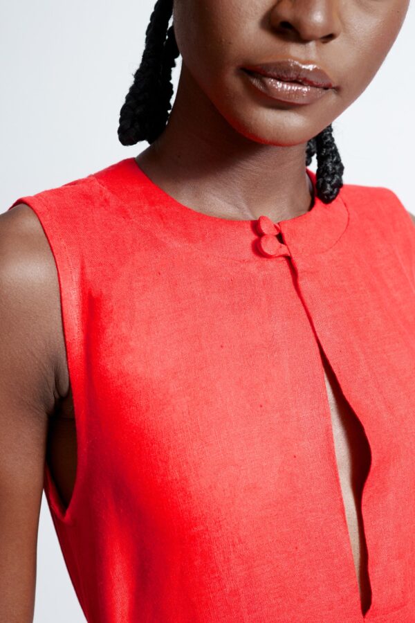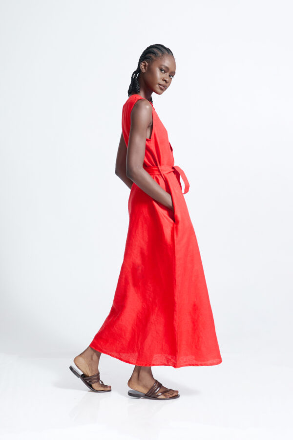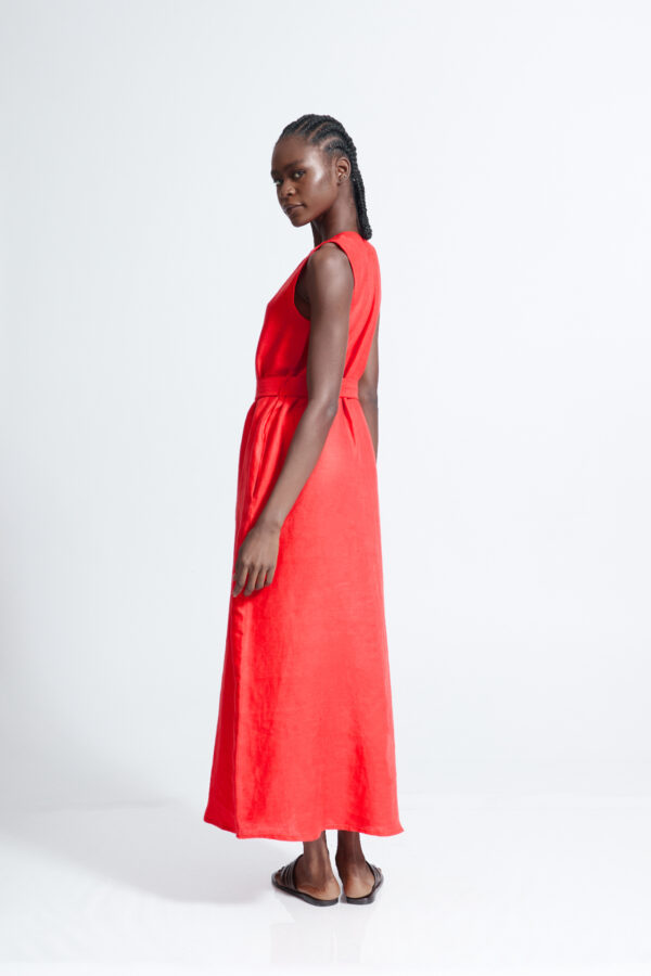 A-line dress with a front slit fastened at the neck with self covered buttons. Removable belt for styling options.