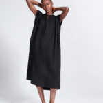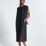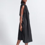 Tunic dress with a front slit tied at the neck, and gathered shoulder detailing.