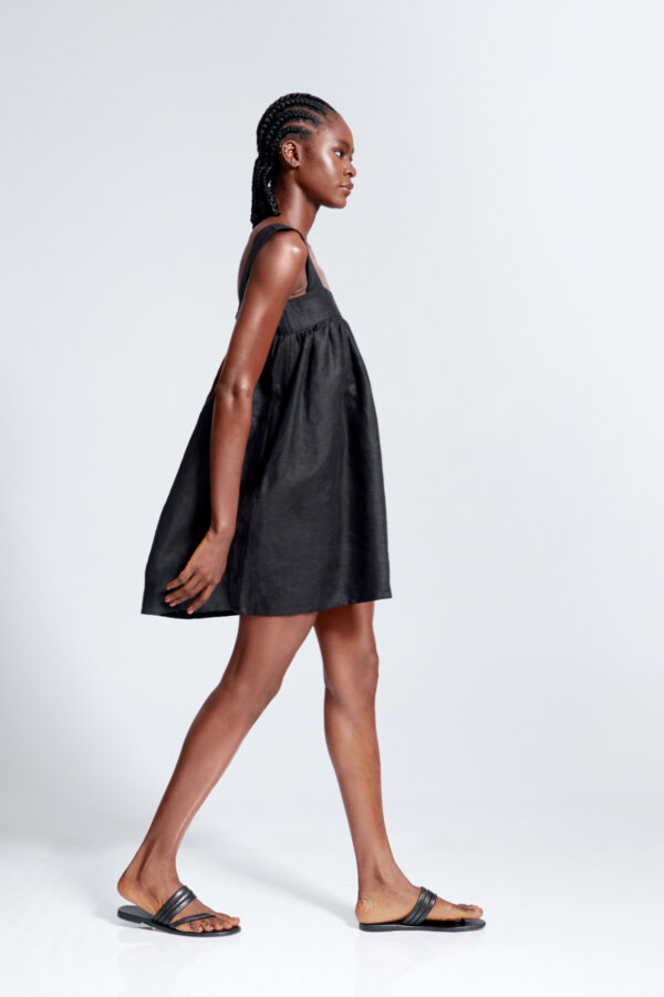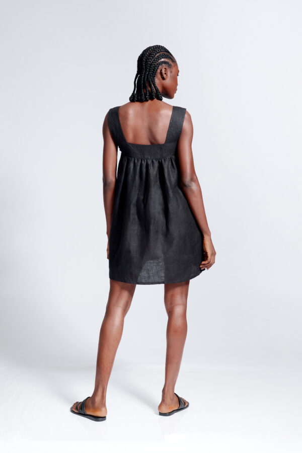 Mini dress with a detailed square neckline, fastens on the side with covered buttons.