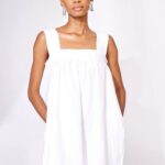 Mini dress with a detailed square neckline, fastens on the side with covered buttons.