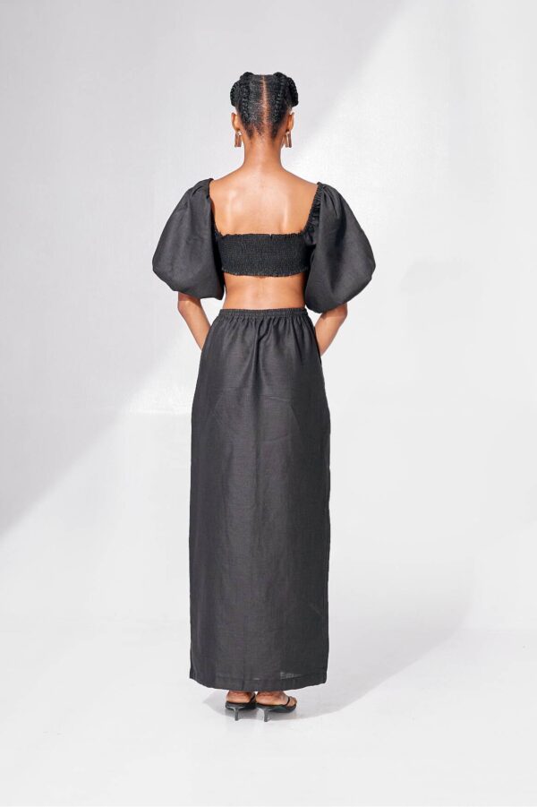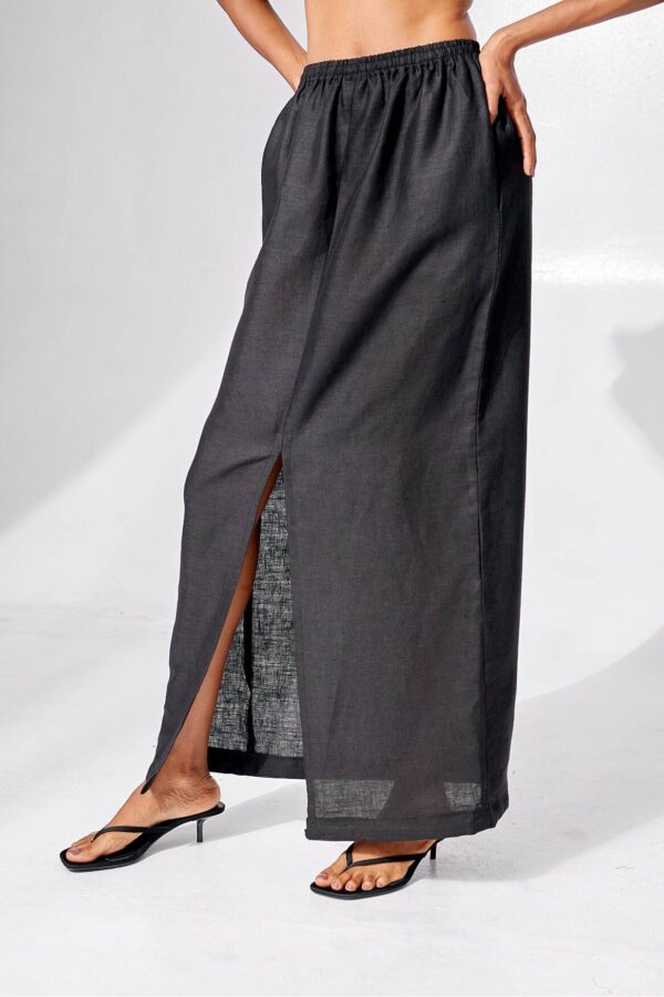 Straight skirt with hidden pockets, front slit and elasticated waist, adjustable with inner drawstrings.