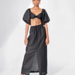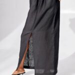 Straight skirt with hidden pockets, front slit and elasticated waist, adjustable with inner drawstrings.