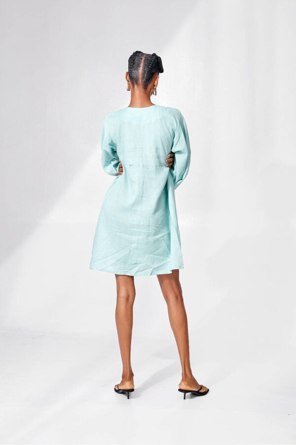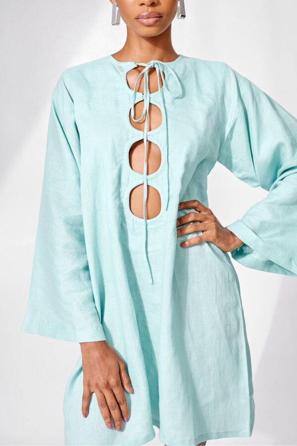 A mini length dress in a timeless tunic style is detailed with cutouts from waist up to a round neckline. Self tie at the front for easy closure.