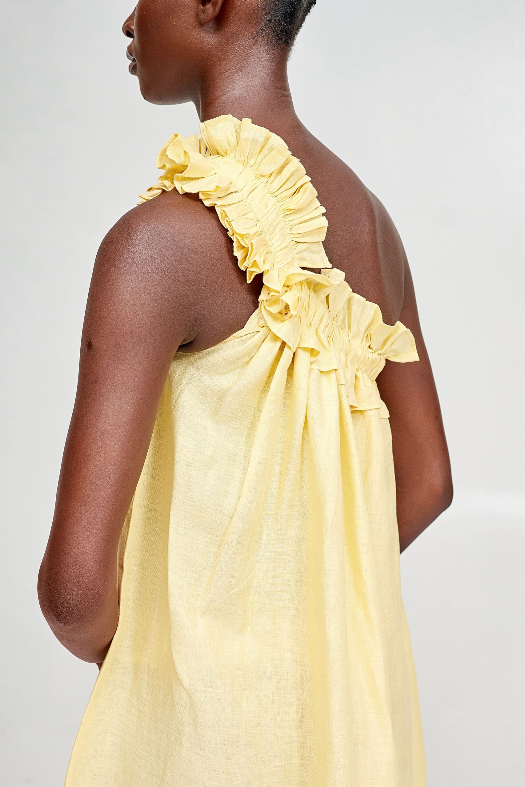 A pull-on one shoulder kaftan with free flowing maxi length. The ruffles along the shoulder adds just enough drama for an every-time dress.